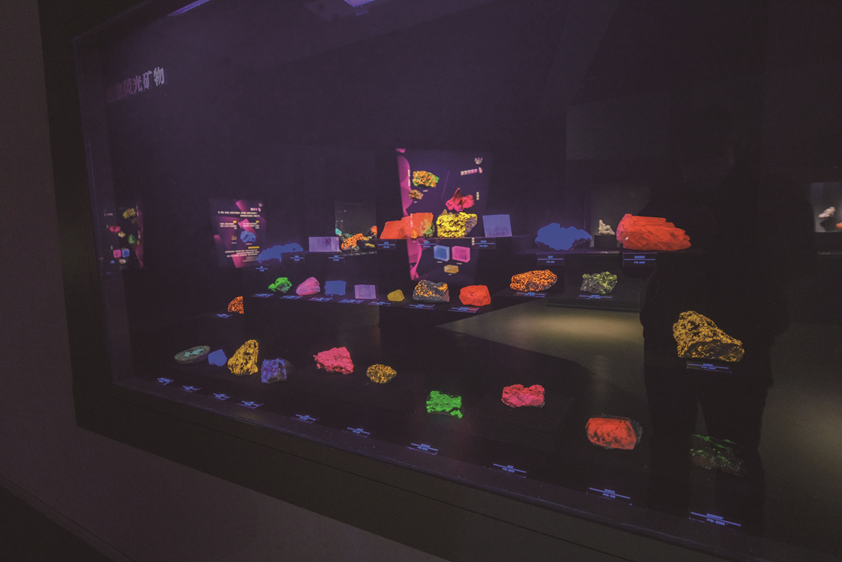 玉石都是矿物。在自然界,矿物质发出的光,有的是荧光,有的是磷光。发荧光的矿物在白天光线充足时,会吸收特定波长的光子,如紫外线或者 X 射线,将其储存在自身某些原子的外层电子里,让这些电子处于激发状态。随后,激发态的电子再把光子释放出来,产生荧光。这类能够产生荧光的矿物,叫作荧光矿物。