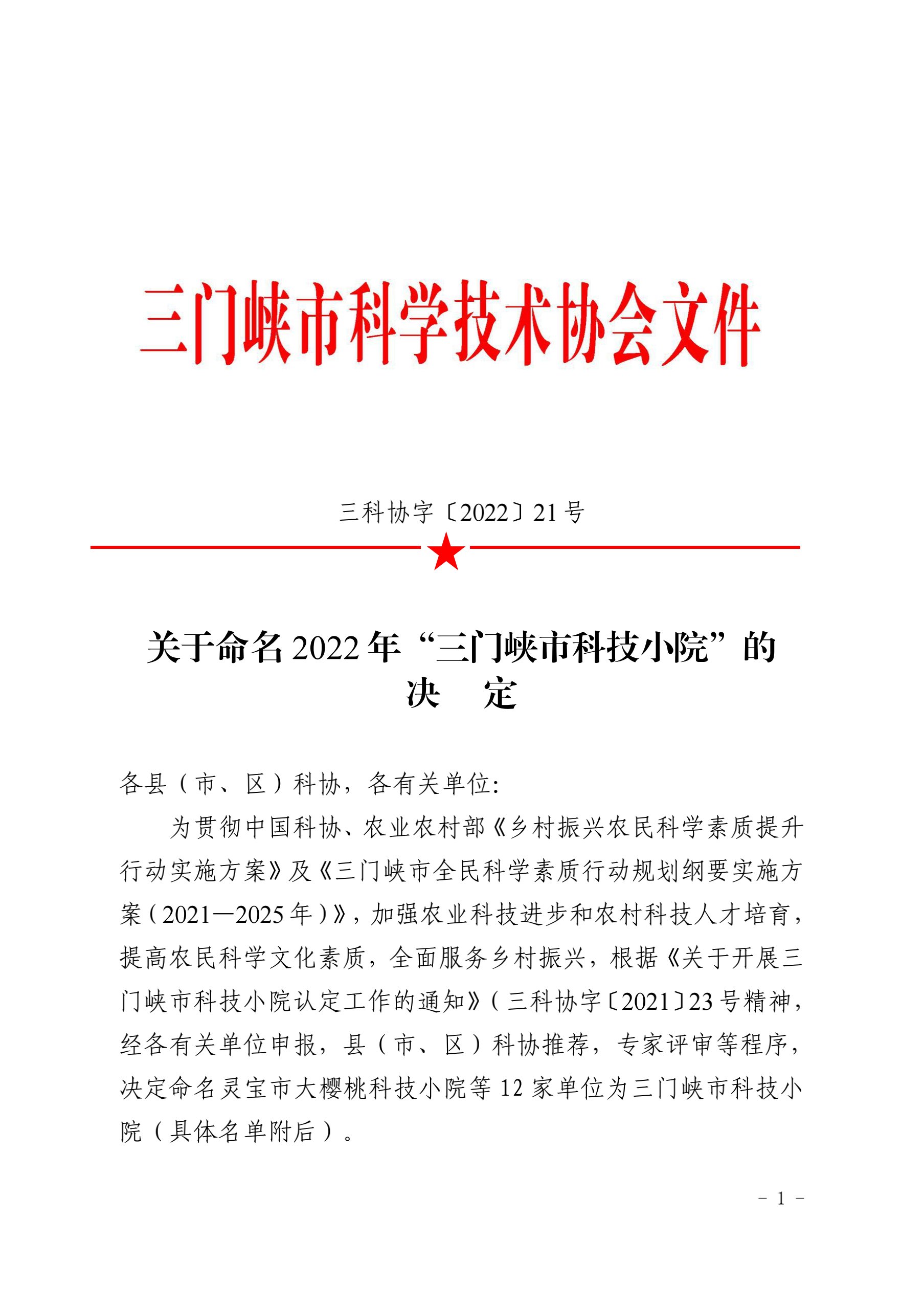 关于命名2022年“三门峡市科技小院”的决定